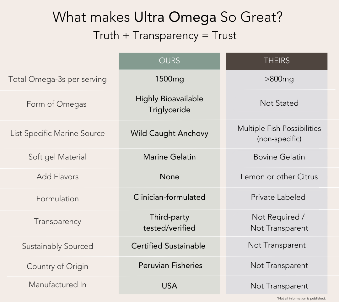 Pure Essentials Ultra Omega is a superior omega-3 formula, reflecting our commitment to purity, potency, and sustainable ingredient sourcing. Superior starts with sustainably caught wild anchovy from the pristine waters of fisheries that are certified by Friend of the Sea and MarinTrust, organizations that honor sustainable practices. Superior is achieved through a process that extracts any potential contaminants or toxins from the fish without diminishing the quality of the fish oil.